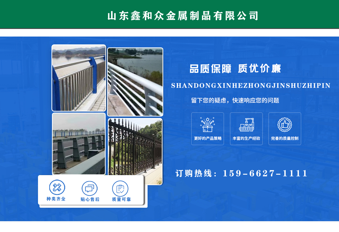 山東鑫和眾金屬制品有限公司主要產(chǎn)品有防撞護欄,橋梁護欄,道路護欄,河道護欄,不銹鋼護欄等護欄。提供設(shè)計方案,一站式定制,包您滿意價格優(yōu)惠,歡迎來電咨詢! 公司常年從事銷售護欄防撞護欄,橋梁護欄,道路護欄,河道護欄,不銹鋼護欄,橋梁鋼護欄,河道燈光護欄等。產(chǎn)品廣泛應(yīng)用于橋梁、河道、旅游景區(qū)、道路、公路、公園、小區(qū)、景觀、道路防撞等領(lǐng)域?! 」井a(chǎn)品均采用優(yōu)質(zhì)不銹鋼材料,符合相關(guān)標準。各種型號不銹鋼復合管及護欄,質(zhì)量嚴格把控。產(chǎn)品強度高、耐腐蝕、焊接牢固、抗沖擊、性能好,防撞護欄結(jié)構(gòu)簡單、美觀實用大方?! g迎前來訂購!...